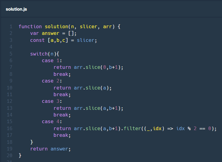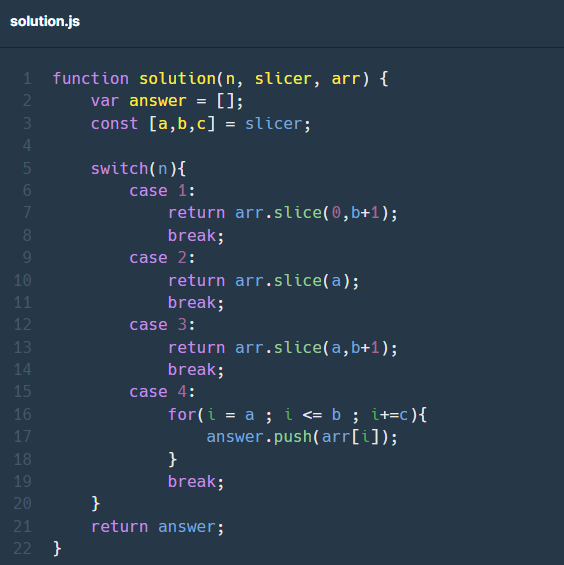 마지막으로 n =4일 경우에는 기본 for문을 a부터 b까지 c씩 증감하도록 하여 조건에 맞는 arr의 요소를 answer에 push 하여 마무리해 주었습니다.