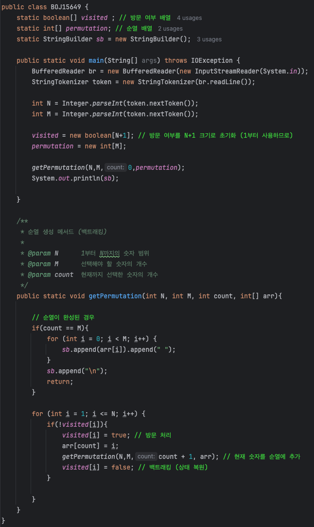 먼저 방문 여부(visited)와 순열을 저장할 배열(Permutation), 결과를 출력할 StringBuilder는 자주 초기화되기 때문에 static으로 선언하여 관리해줍니다.