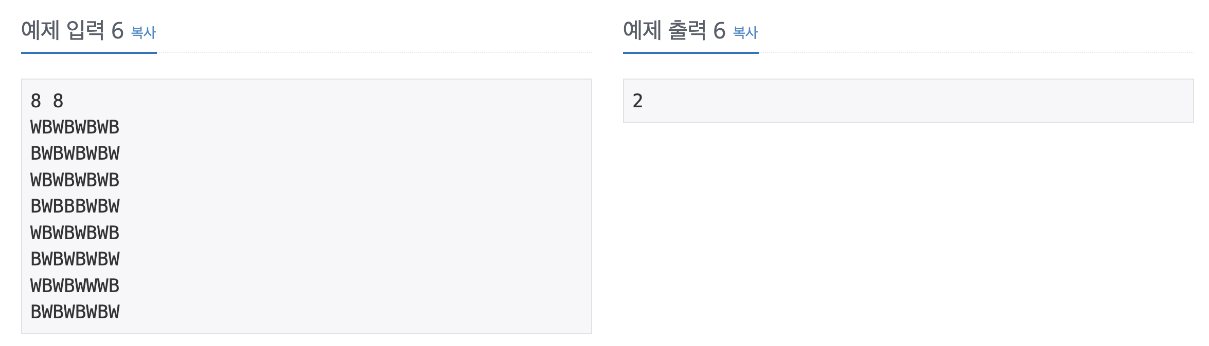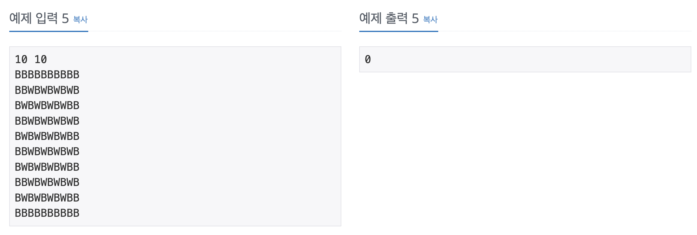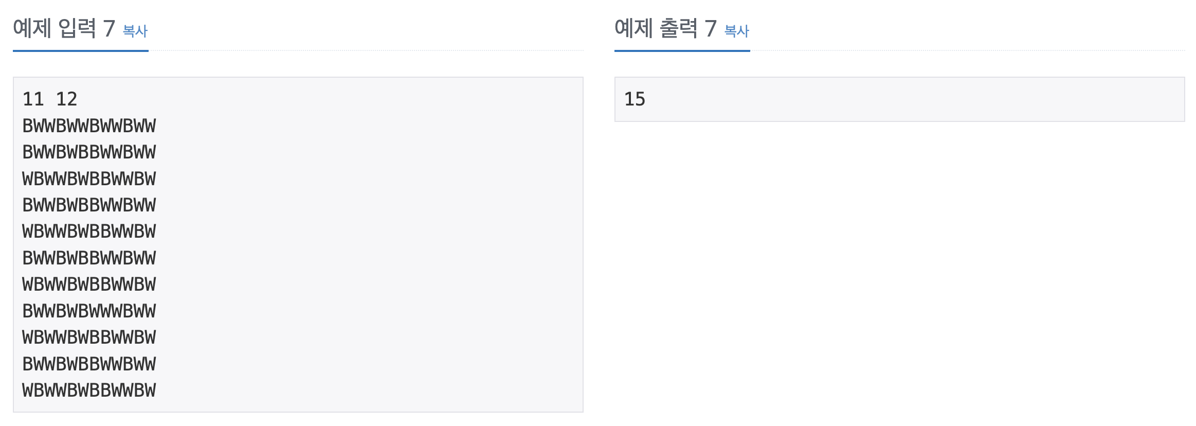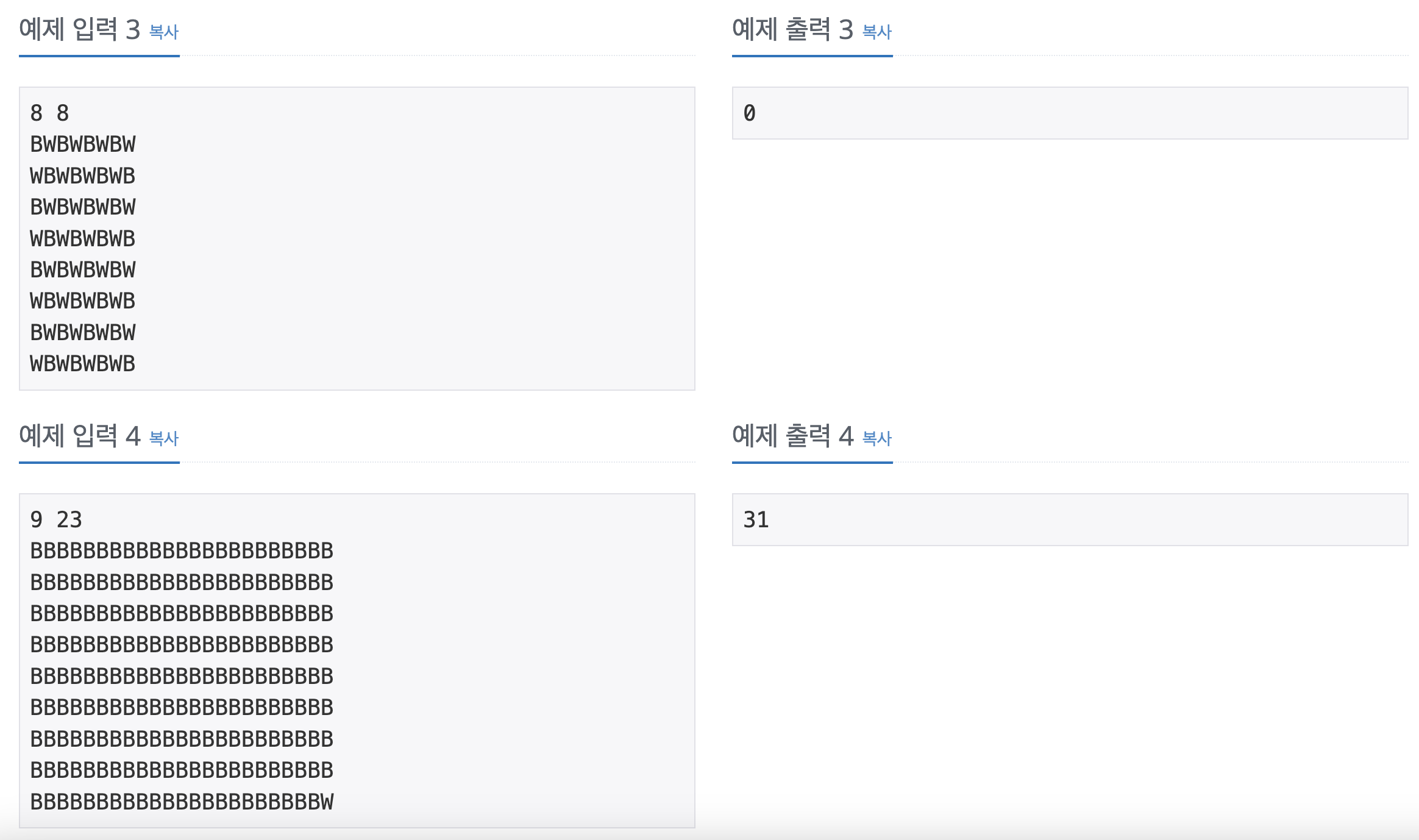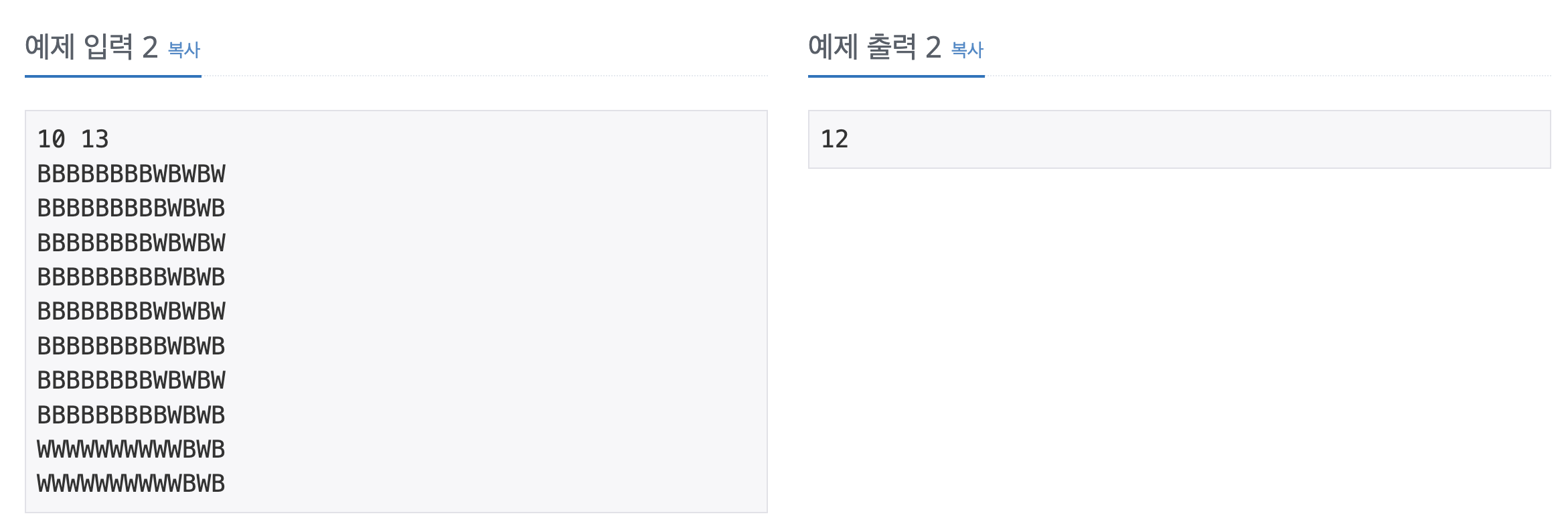 - 입력으로 주어지는 체스판은 8X8크기가 넘을 수 있기 때문에 가능한 8 X 8
