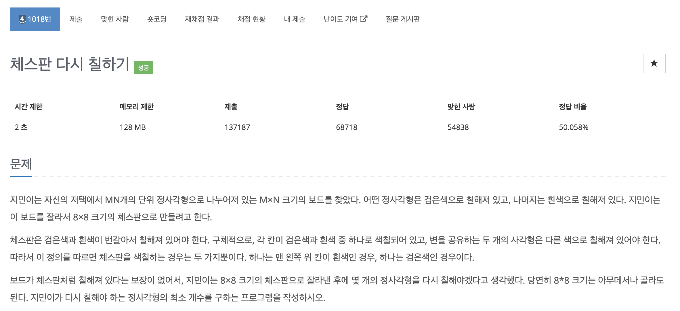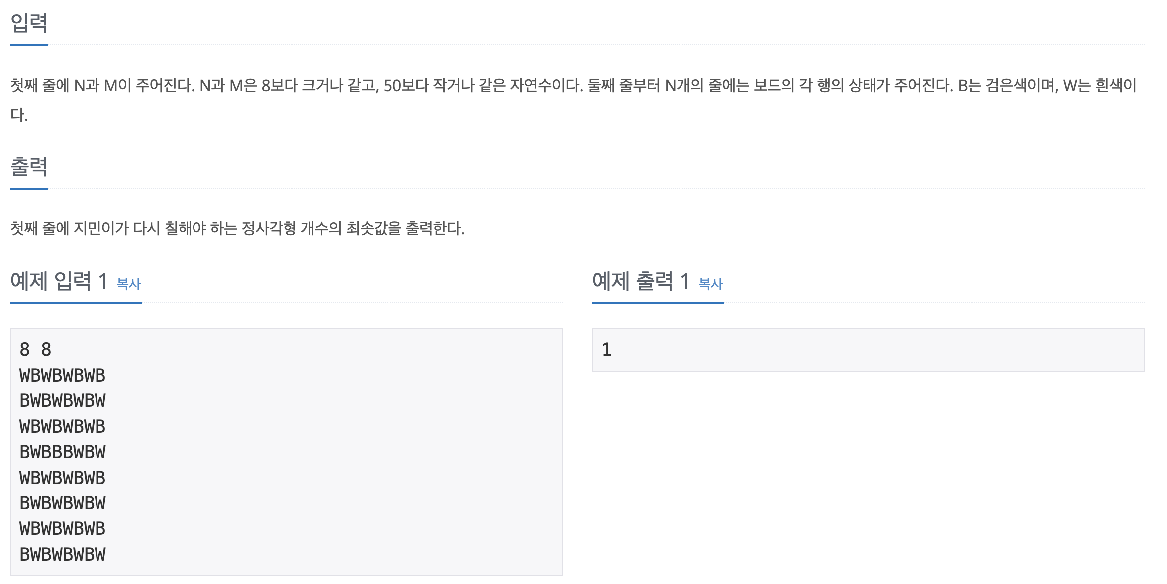 브루트 포스 알고리즘을 사용하여 풀이한다면 문제 자체는 어렵지 않고 체스판을 8 X 8로 자르는 것이 포인트라고 생각합니다.