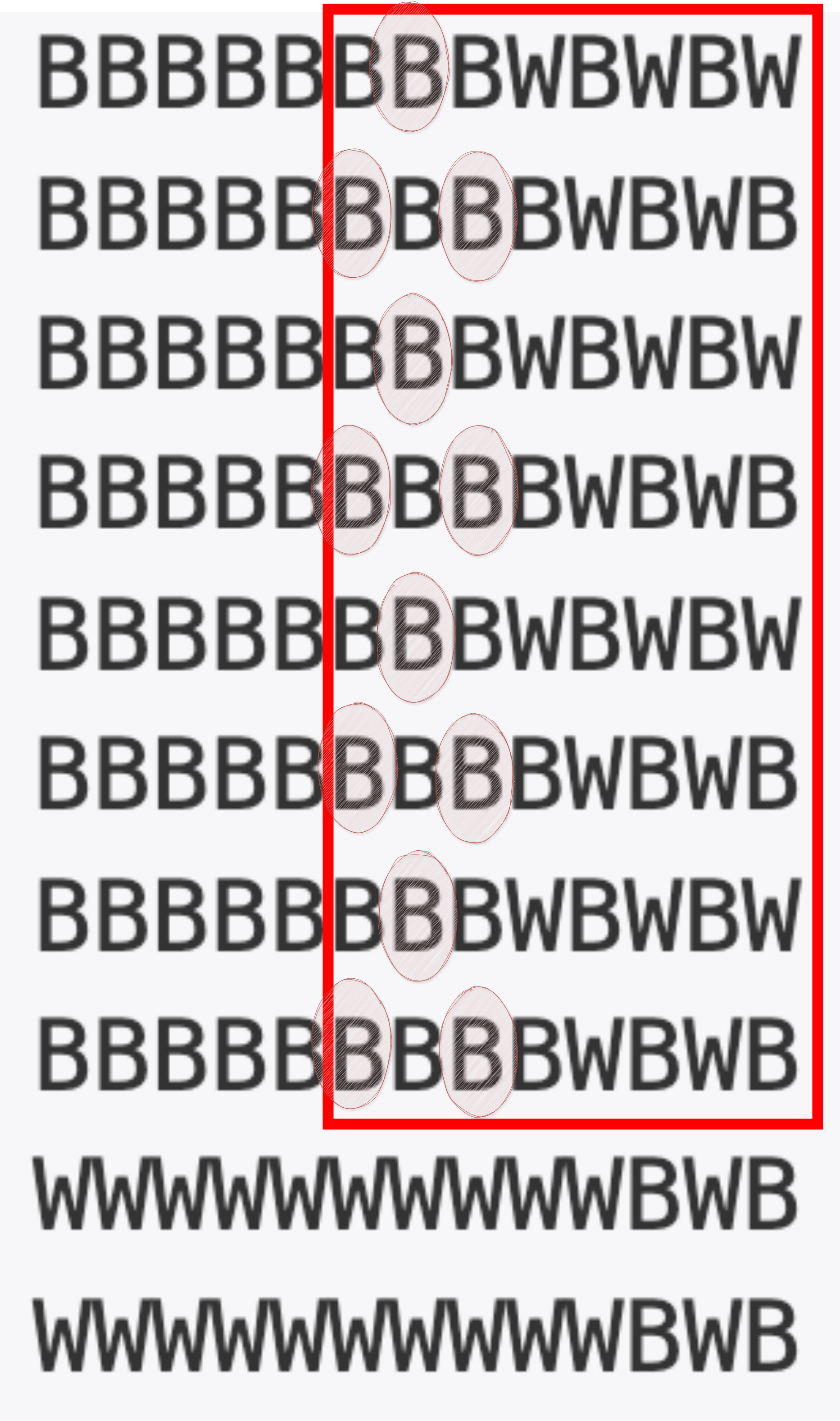 시작하는 행(startRow)의 위치와 시작하는 열(startCol)의 위치, 비교할 패턴(black 또는 white), 그리고 비교할 체스판(board)을 매개변수로 받아, 8 x 8 크기의 부분 체스판에서 다시 칠해야 하는 정사각형의 개수를 계산합니다.