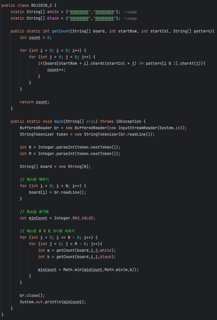 이후, getCount() 메서드를 호출하여 각 패턴(white, black)에 대해 다시 칠해야 하는 칸의 개수를 계산합니다. 그리고 Math.min() 메서드를 사용해 각 8 x 8 체스판에서의 최솟값을 구합니다.