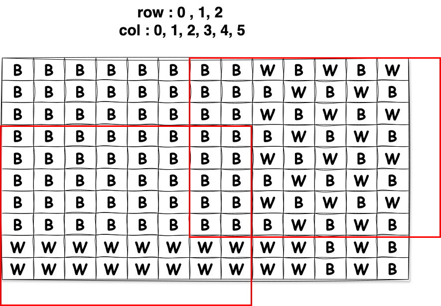 그렇다면 해당 체스판은 8 X 8 보다 크기 떄문에 크기에 맞춰 잘라줘야 합니다. 이 때 이해하기 쉽도록 N과M을 row와 col로 부르겠습니다.