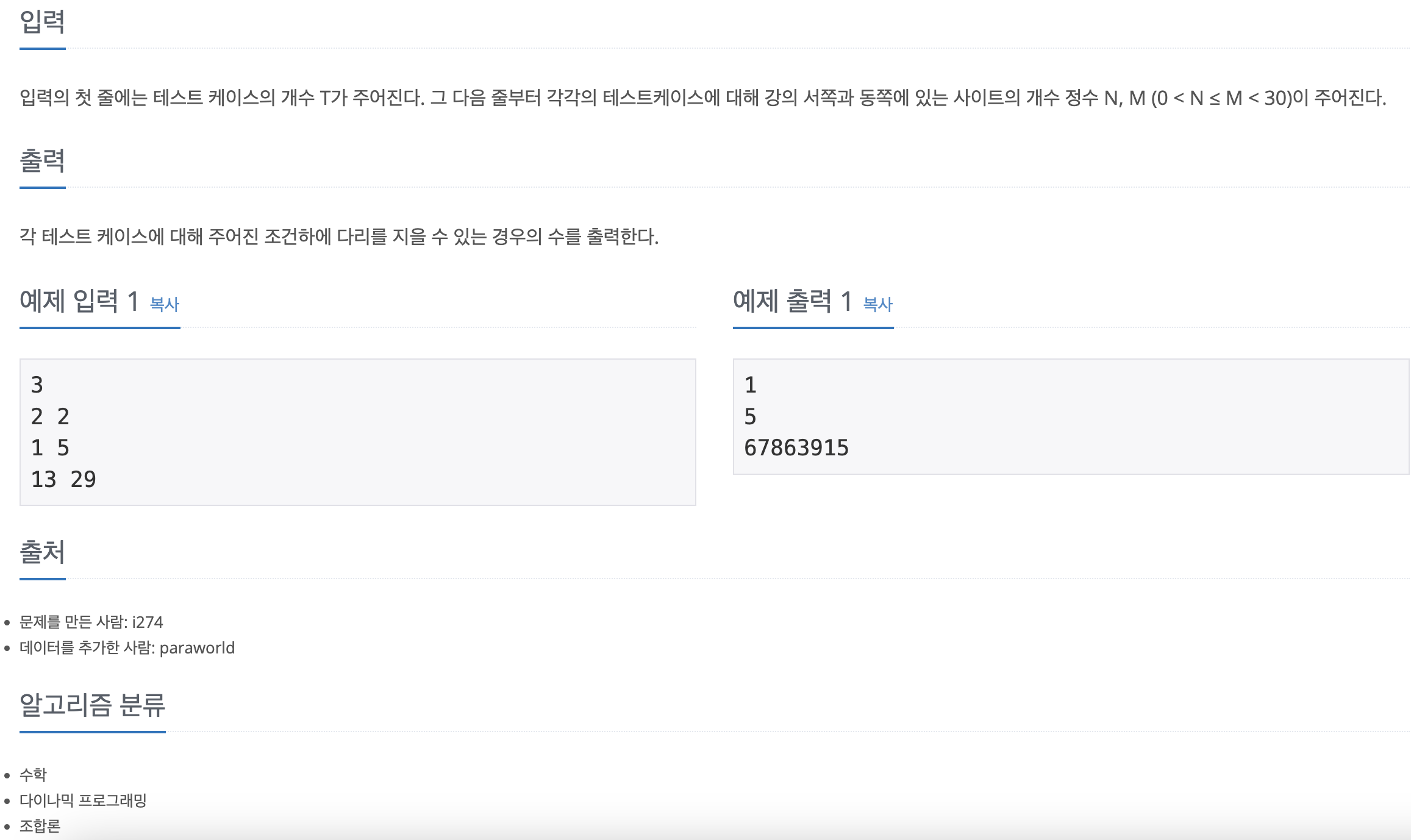 이번 "백준 - 다리 놓기"문제는 조합론을 활용하여 해결할 수 있는 문제입니다. 문제 자체는 어렵지 않으나 이항 계수의 공식이나 개념을 모른다면 쉽지 않은 문제입니다.