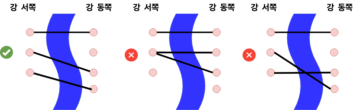 - 서쪽 사이트와 동쪽 사이트를 다리로 연결하려고한다, 이 때 한 사이트에는 한 개의 다리만 연결할 수 있다.