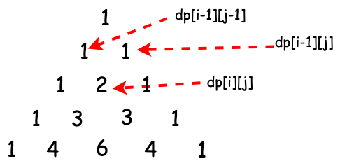 dp[i][j] = dp[i - 1][j - 1] + dp[i - 1][j];