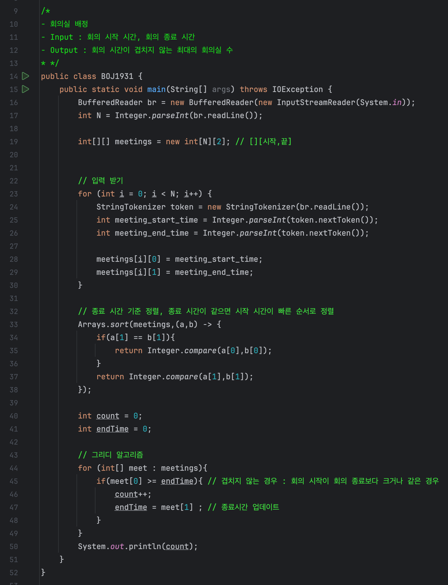 이렇게 정렬된 회의 시간을 저장한 배열 meetings에서, meetings를 순회하며 회의 시작 시간이 이전 회의의 종료 시간보다 크거나 같을 경우 회의실 배정 카운트를 증가시키고, 종료 시간을 업데이트합니다.
