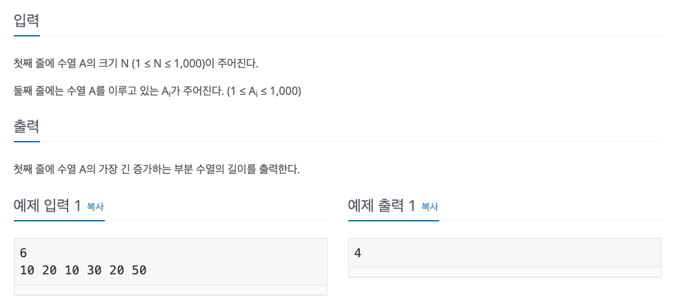 수열 A가 주어졌을 때, 가장 긴 증가하는 부분 수열을 구하는 프로그램을 작성하는 문제입니다. 문제에서 나와있듯이 A = {10, 20, 10, 30, 20, 50} 인 경우에 가장 긴 증가하는 부분 수열은 A = {10, 20, 10, 30, 20, 50} 이고, 길이는 4입니다.