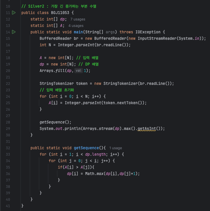 결국, dp 배열에는 각 원소를 끝으로 하는 가장 긴 증가하는 부분 수열의 길이가 저장되며, 그 중 가장 큰 값을 Stream의 max()메서드와 getAsInt()메서드를 사용하여 최댓값을 찾아 LIS의 길이를 구할 수 있습니다.