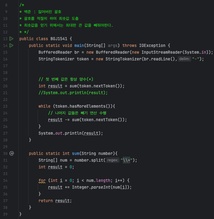 먼저 BufferedReader 클래스로 입력을 받아주고, StringTokenizer 클래스로 입력을 "-"를 기준으로 토큰으로 분리해줍니다.