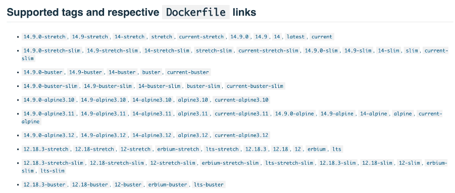 docker hub의 node페이지를 보면 위와 같이 많은 태그 리스트들이 있습니다. 여기있는 모두는 "node:" 뒤에 설정할 수 있는 태그들입니다.