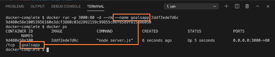 위와 같이 "goalsapp"으로 컨테이너에 이름을 부여하고, docker ps 명령어로 컨테이너 목록을 확인한다면 컨테이너를 만들 때 부여한 이름이 지정된 것을 확인할 수 있습니다.