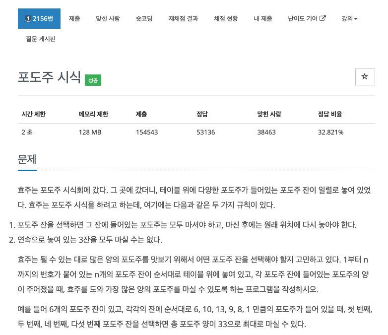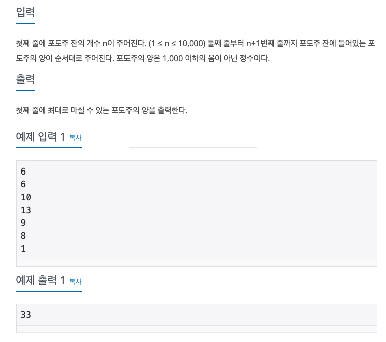 문제의 핵심은 연속해서 3잔을 마실 수 없을 때 최대의 포도주 양을 구하는 것이 기 때문에, 이 점을 고려해야합니다.