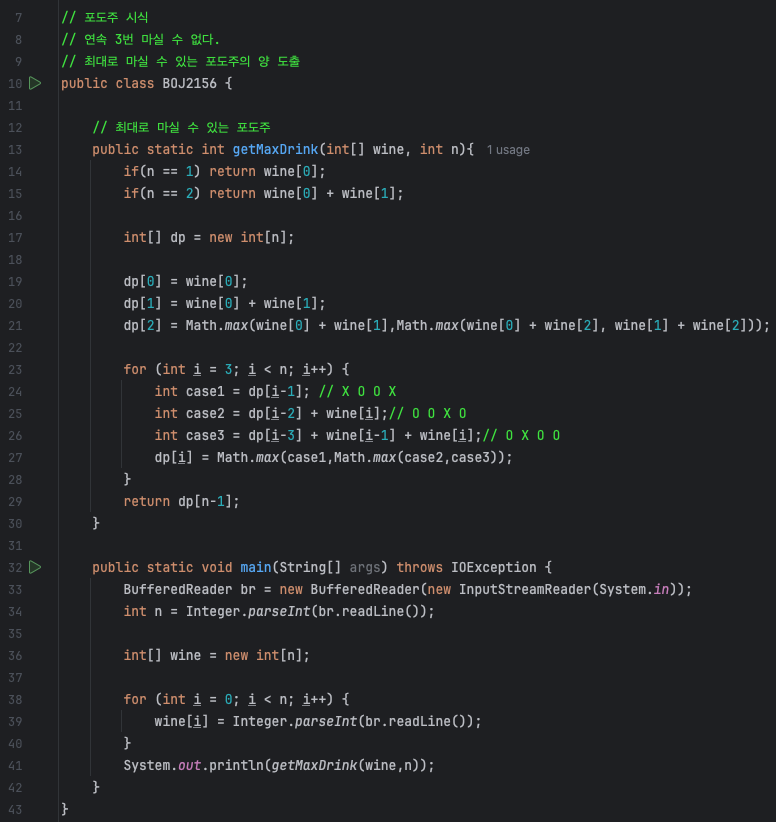 또한 문제의 핵심인 '연속 3잔을 마실 수 없다'는 조건 때문에, 각 위치에서 가능한 경우의 수를 검토하여 최대값을 dp 배열에 저장해나가면, 최종적으로 dp 배열의 마지막 인덱스에 최대로 마실 수 있는 포도주의 양이 저장됩니다.