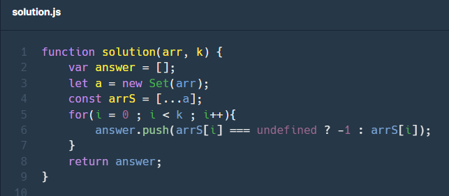 그렇게 된다면 중복을 제거한 arrS배열이 형성되는데 그리고 0번째 요소부터 k번째까지 undefined가 아니라면 answer 배열에 넣어줍니다.