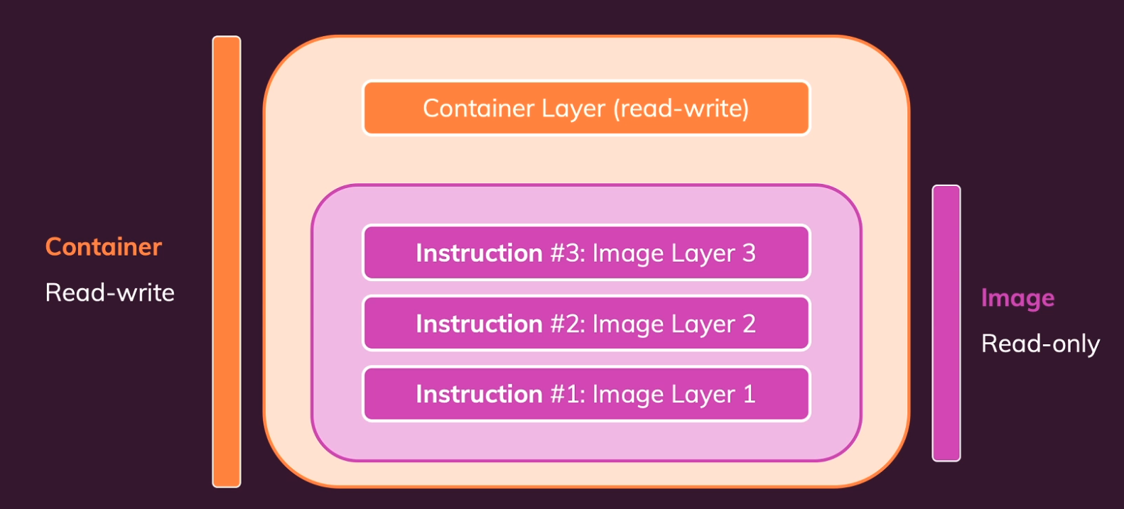 Docker 이미지는 읽기 전용(Read-only)으로 구성되어 있으며, 컨테이너가 실행될 때는 이 이미지 위에 읽기-쓰기(Read-write) 레이어가 추가됩니다.