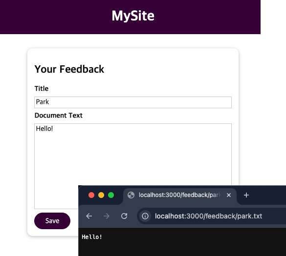 웹 페이지에서 제목과 내용을 입력받아 텍스트 파일로 저장하는 Node.js 애플리케이션입니다. 제목은 파일명이 되고, 저장된 파일은 '/feedback/파일명.txt' 경로로 접근할 수 있습니다.