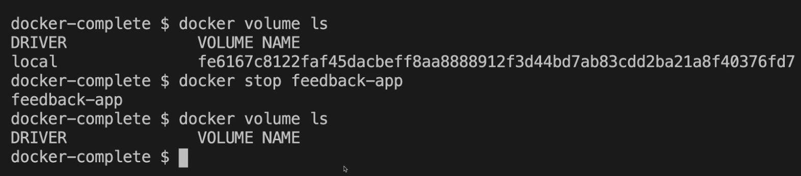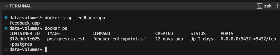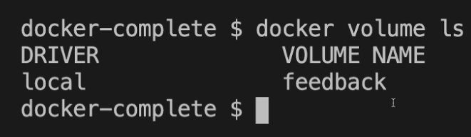 docker volume ls 명령어로 확인해보면, 컨테이너가 중지되었음에도 앞서 -v 옵션으로 생성한 'feedback' 볼륨이 그대로 남아있는 것을 볼 수 있습니다.
