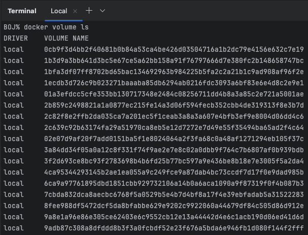 위 이미지에서 볼 수 있듯이, 수많은 익명 볼륨들이 시스템에 남아있게 되어 불필요한 저장 공간을 차지하게 됩니다. 이러한 상황을 방지하기 위해서는 --rm 옵션을 사용하거나, "docker volume prune" 명령어로 주기적인 정리가 필요합니다.