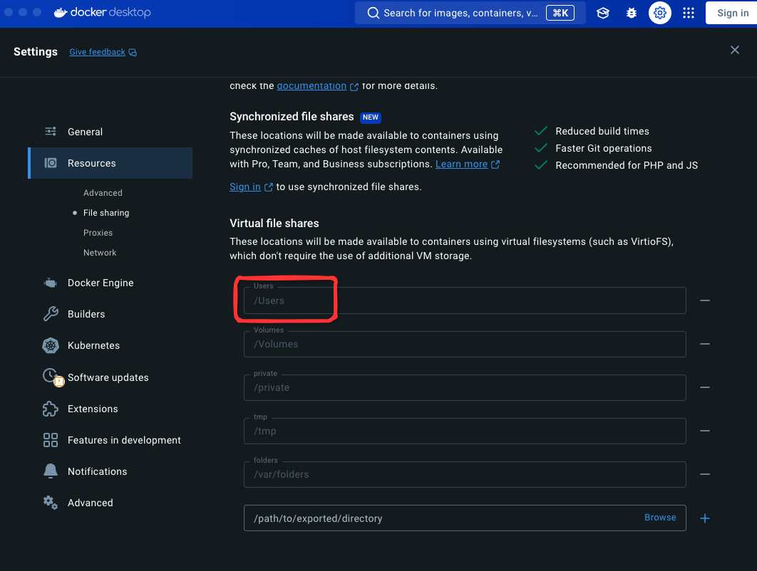 필자의 경우 프로젝트가 Users 디렉토리 하위에 존재하기 때문에 도커가 자동으로 액세스할 수 있습니다. 이는 File sharing-Resource 메뉴에 Users 디렉토리가 기본적으로 리스팅되어 있기 때문입니다.