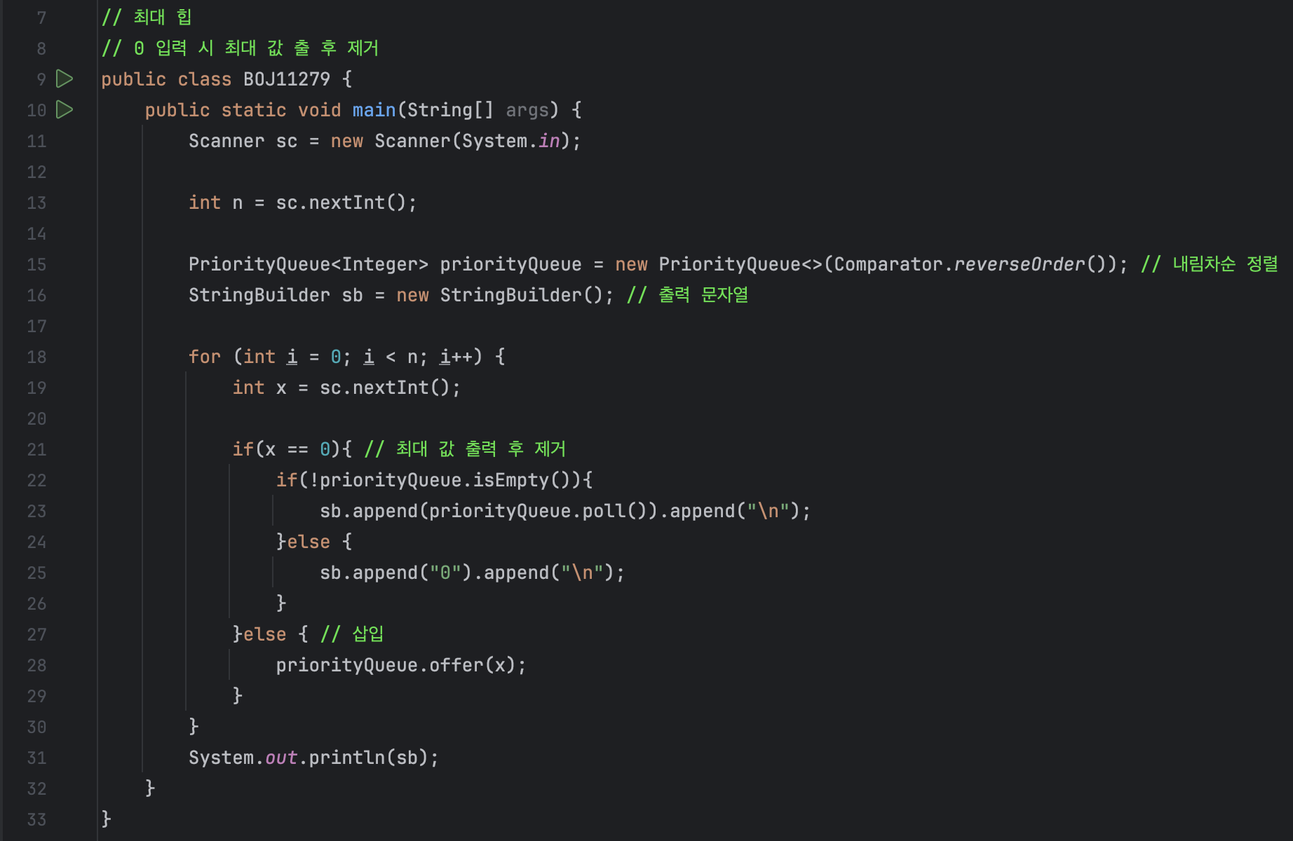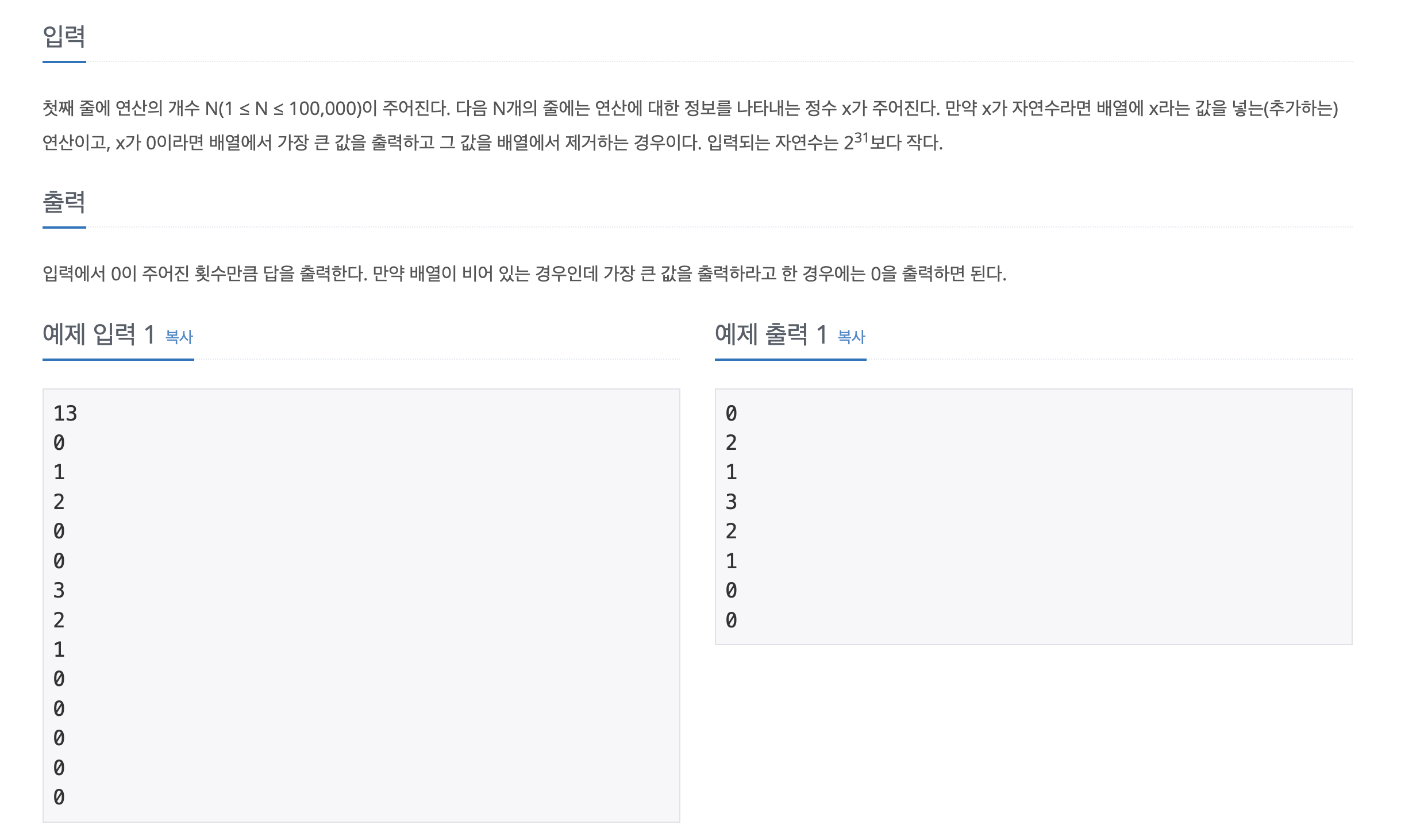 "백준 - 최대 힙" 문제는 최소 힙 문제와 한가지만 틀리고 같은 맥락의 문제입니다. 배열에 자연수 x를 넣고, 0이 입력될 때 배열에서 최대값을 출력하는 문제입니다.