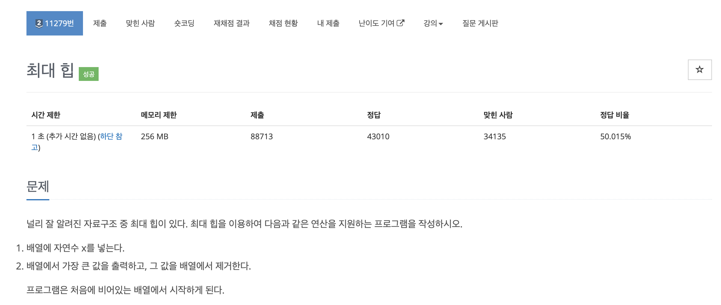 시간제한이 1초이기 때문에 내부적으로 힙구조를 사용하여 항상 최댓값 혹은 최솟값을 출력할 수 있는 우선순위 큐를 사용하여 풀이해야 합니다.