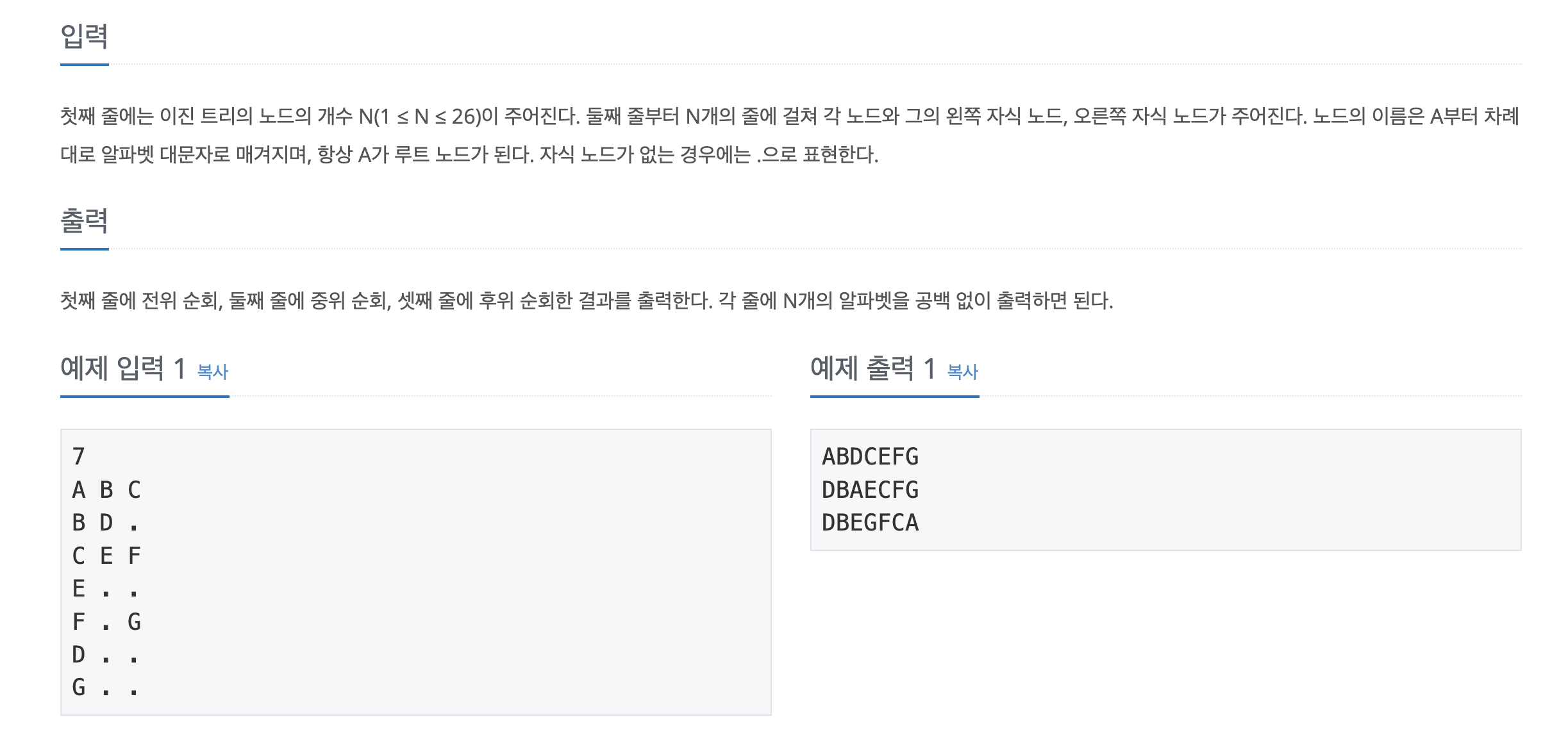 "백준 - 트리 순회" 문제는 순회 방식인 전위, 중위, 후위 순회 방식을 사용하여 트리를 탐색하는 문제입니다. 문제의 핵심은 트리 구조를 직접 구현하는 것입니다.
