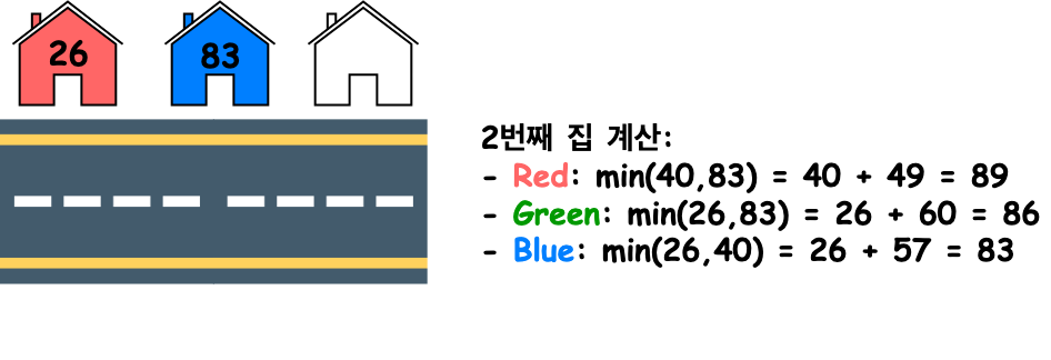 따라서 이전 색상인 빨간색(26)과 현재 칠할 수 있는 초록색과 파란색 중 파란색으로 칠할 때 최솟값이 됩니다.