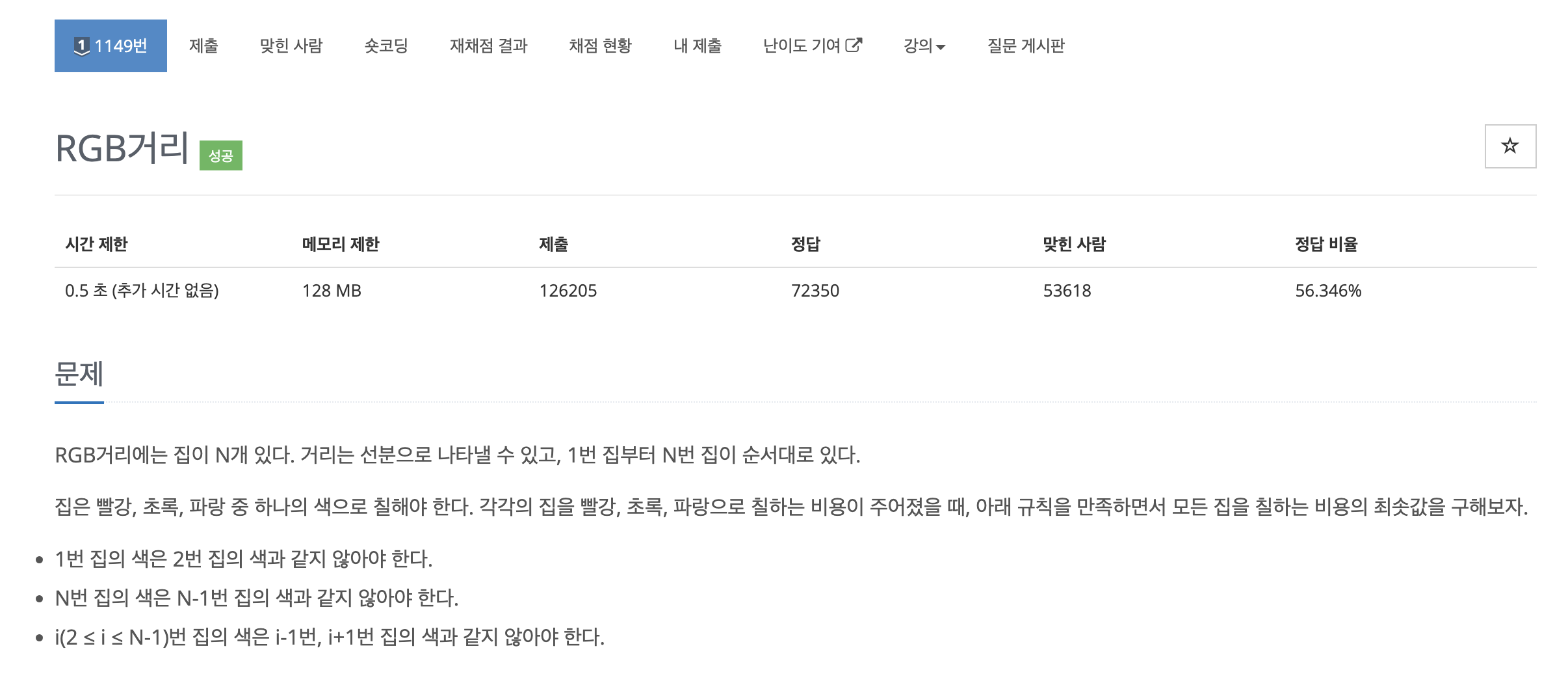 "백준 - RGB 거리" 문제는 거리에 있는 집들을 R(red), G(green), B(blue)로 칠할 때, 다음 제약사항을 만족하면서 최소 비용으로 칠하는 문제입니다.