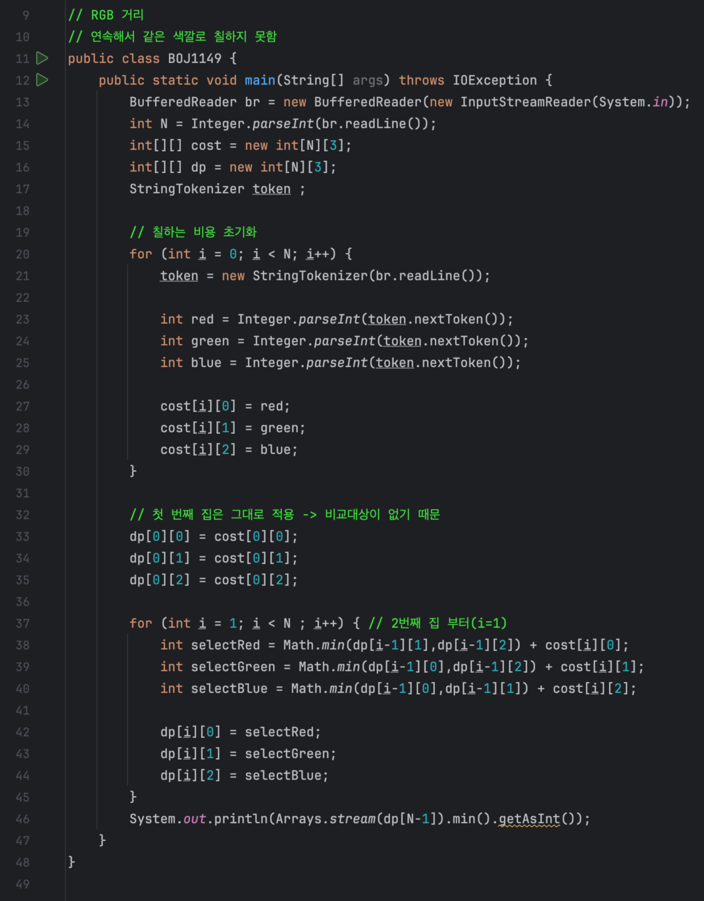 - 마지막 집까지 칠한 후, DP 배열의 마지막 행에서 최솟값이 답이 됩니다.