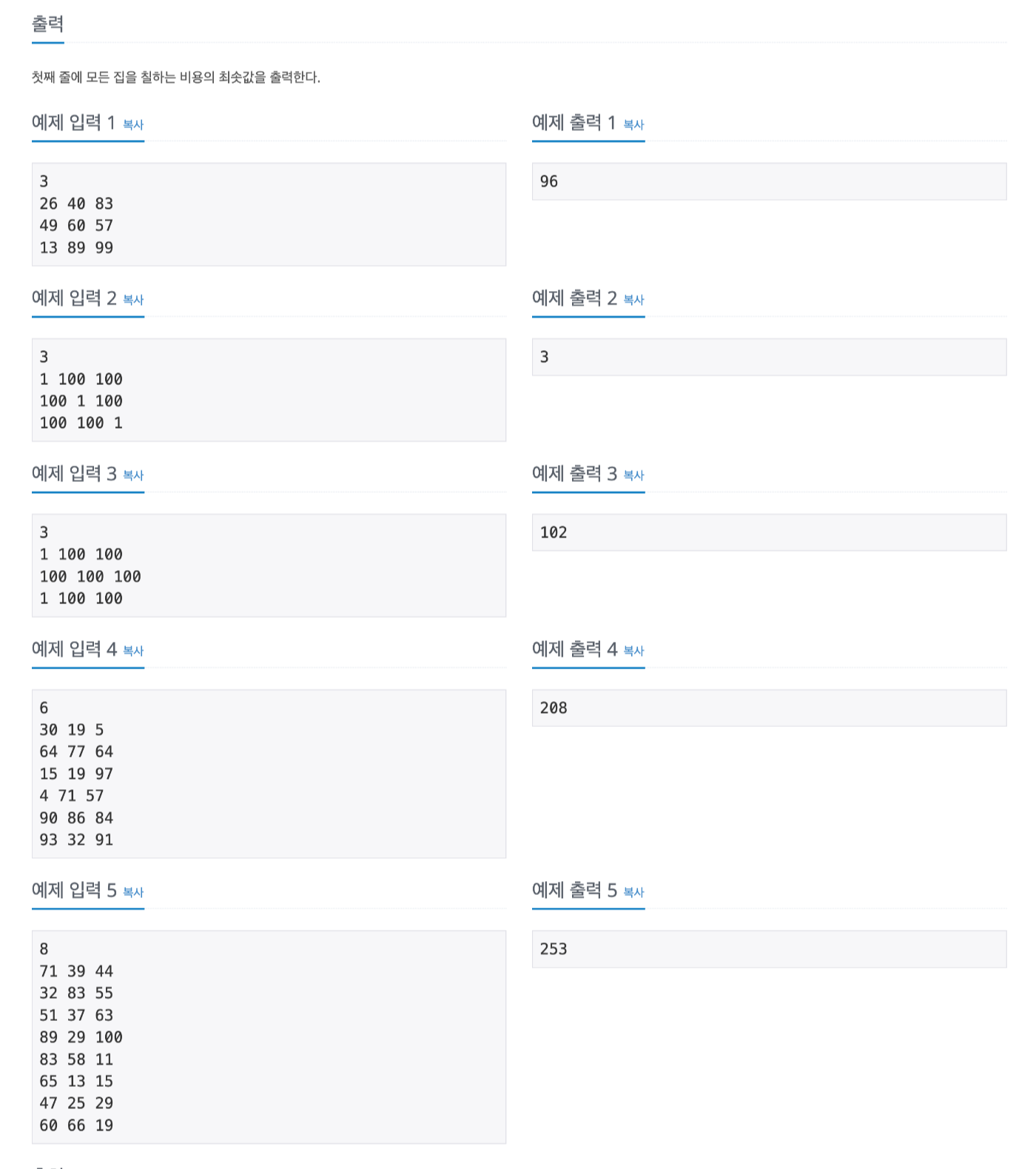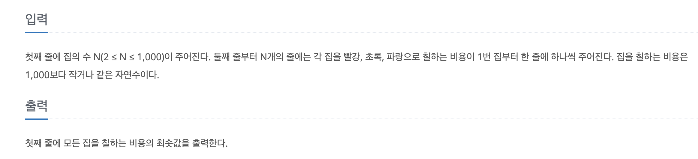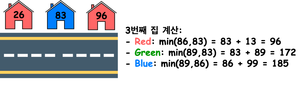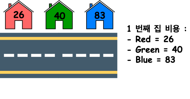 문제의 목표는 총 3개의 집을 칠해야할 때 최소 비용을 구하는 것입니다.