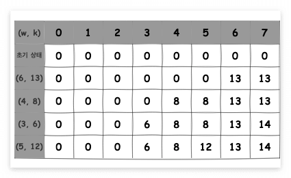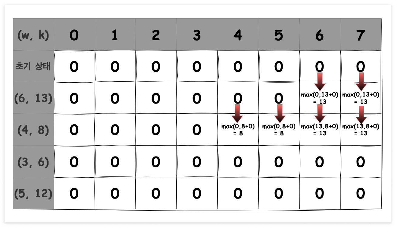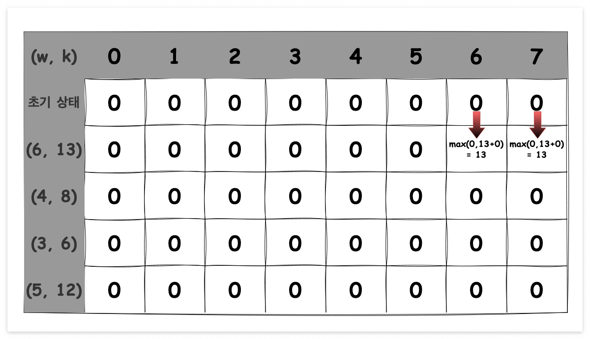 (6,13) 물건을 k=6일 때 고려할 때, 바로 윗칸의 0은 현재 물건을 넣지 않았을 때의 값이고, 물건을 넣는 경우는 남은 무게(6-6=0)의 윗칸 값(0)에 현재 물건의 가치(13)를 더한 13이 됩니다. 이 두 값을 비교하여 더 큰 값인 13을 선택합니다.