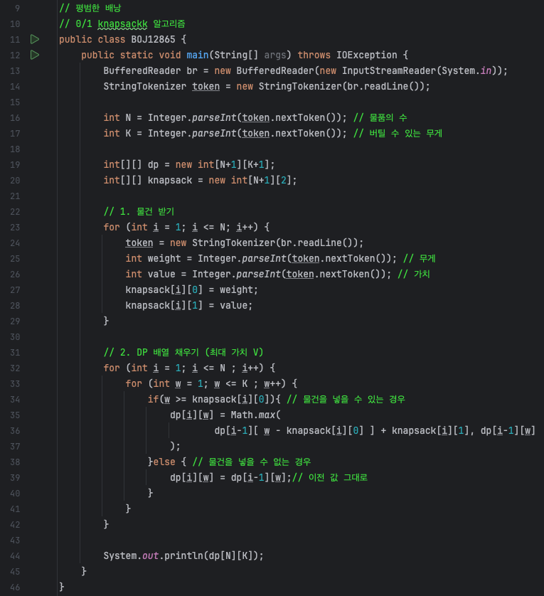 배낭에 물건을 넣을 수 있을 때 Math.max() 메서드를 사용하여 바로 윗칸(dp[i-1][w])값과 현재 물건을 배낭에 넣었을 때의 가치(dp[i-1][w-knapsack[i][0]] + knapsack[i][1])를 비교하여 더 큰 값으로 업데이트합니다.