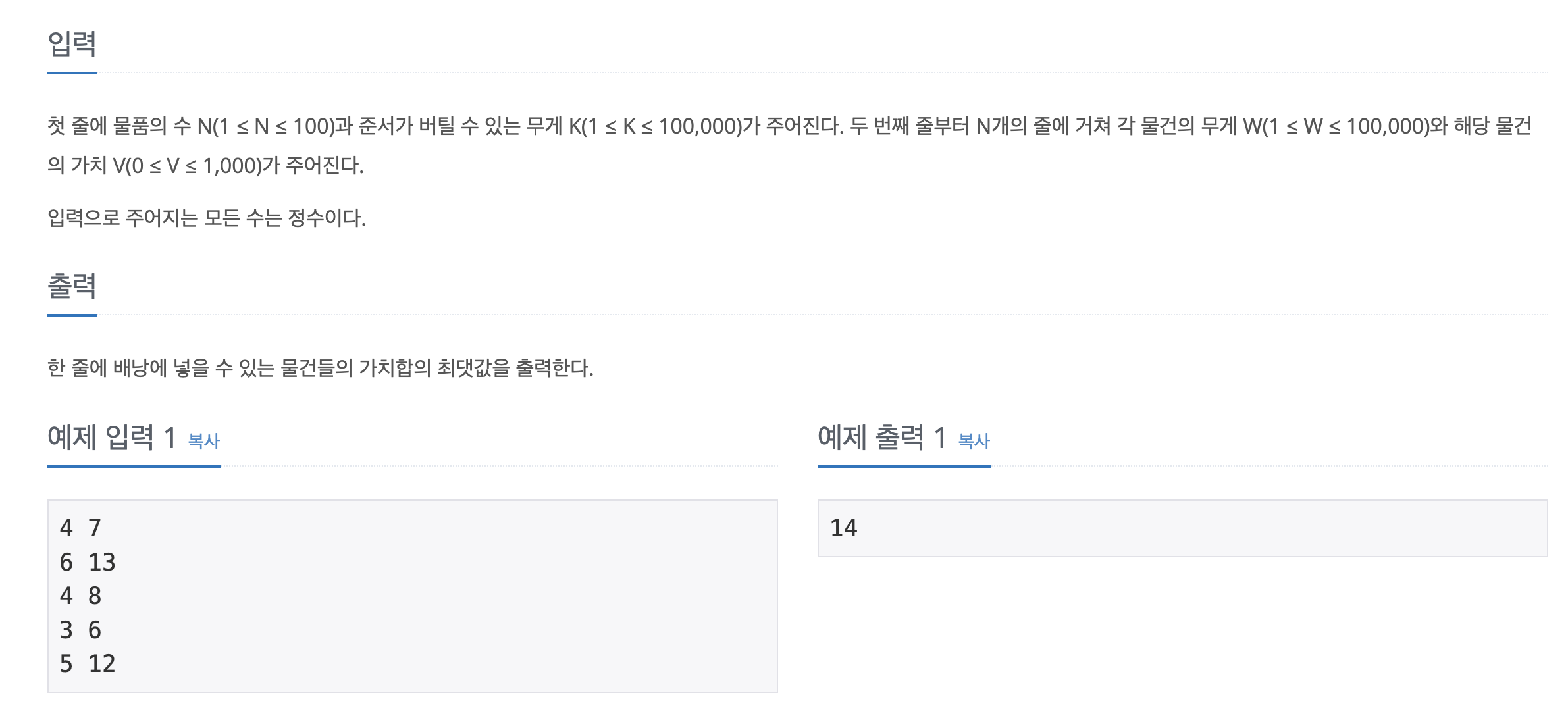 배낭의 무게 제한이 존재하고, 물건은 무게와 가치를 가집니다. 이 때 배낭에 최대한 가치있는 물건만을 담을 수 있는 가치의 최댓값을 출력해야합니다.