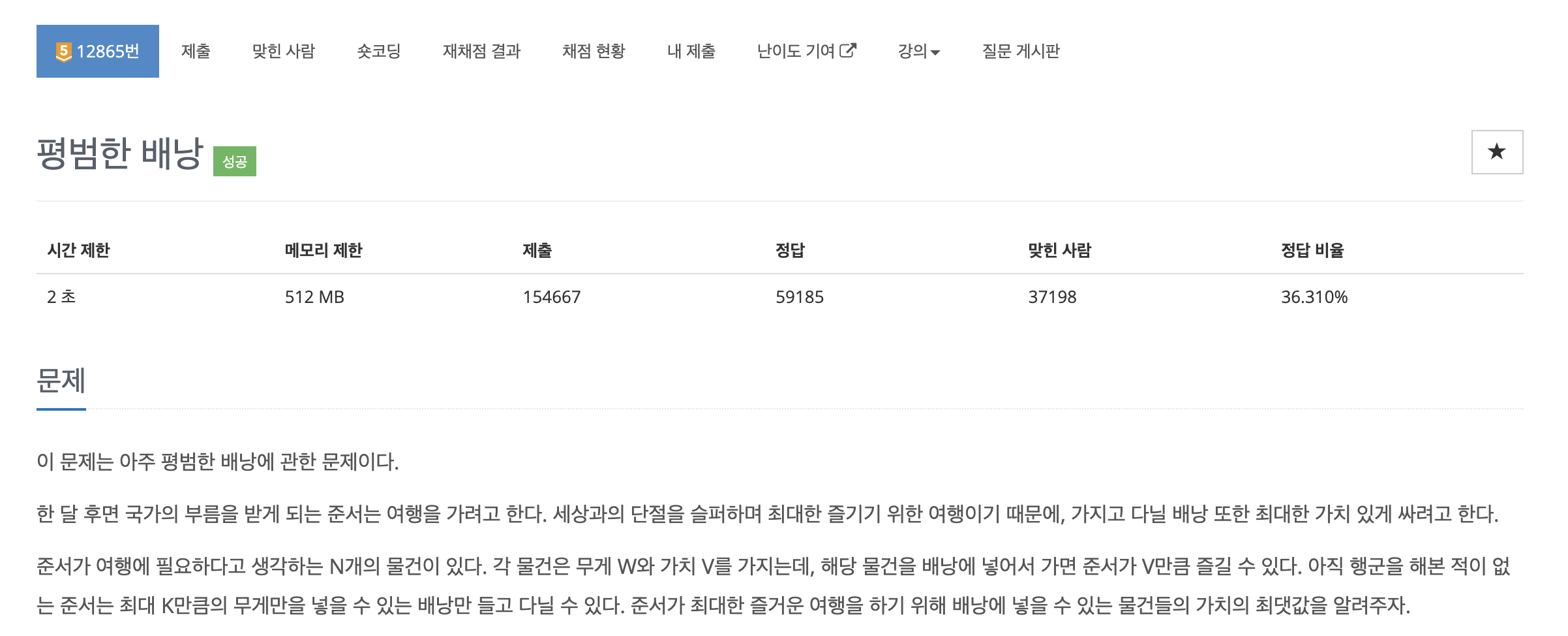 "백준 - 평범한 배낭" 문제는 knapsack 알고리즘 중 0/1 knapsack 알고리즘을 사용하여 풀 수 있는 대표적인 문제입니다.
