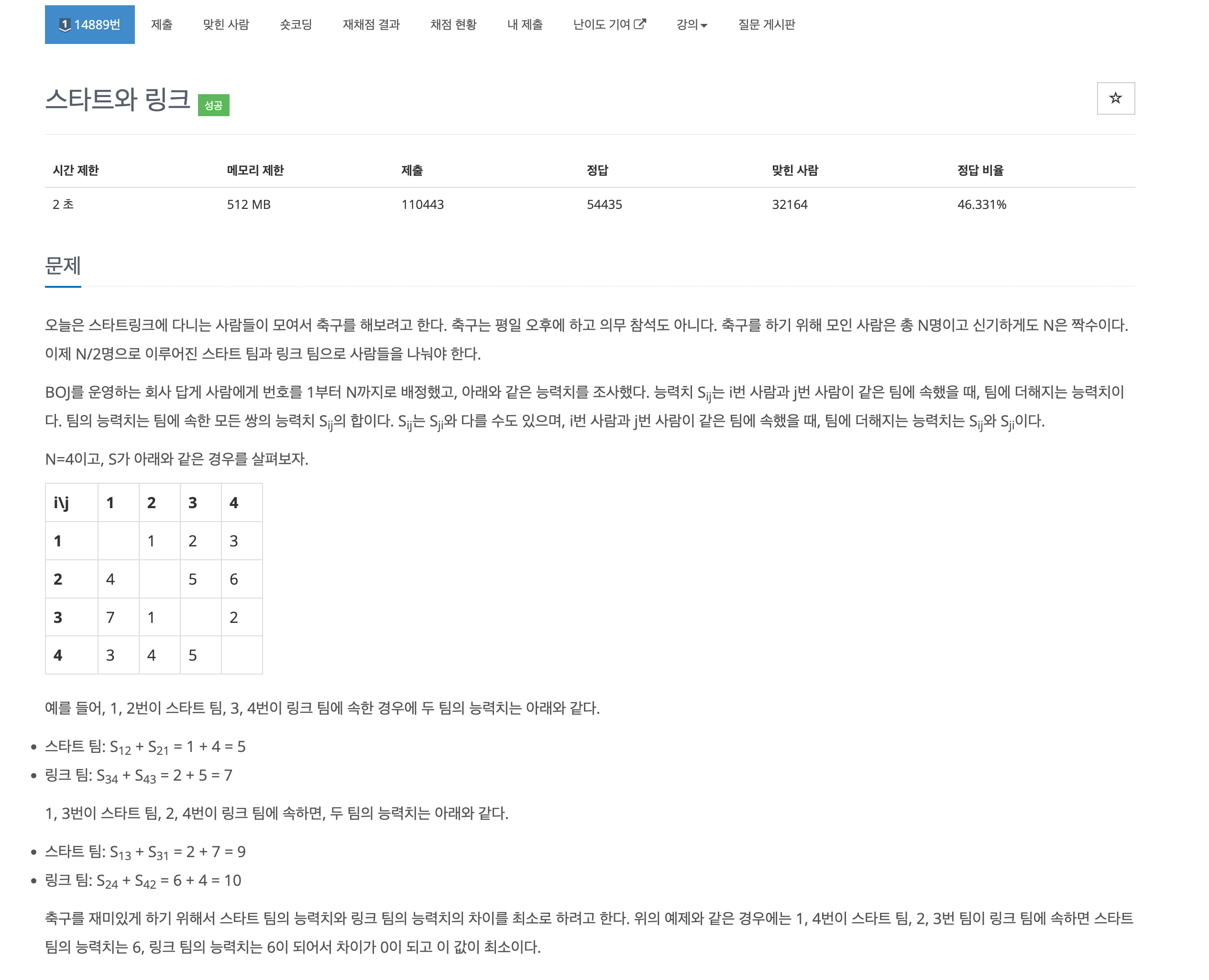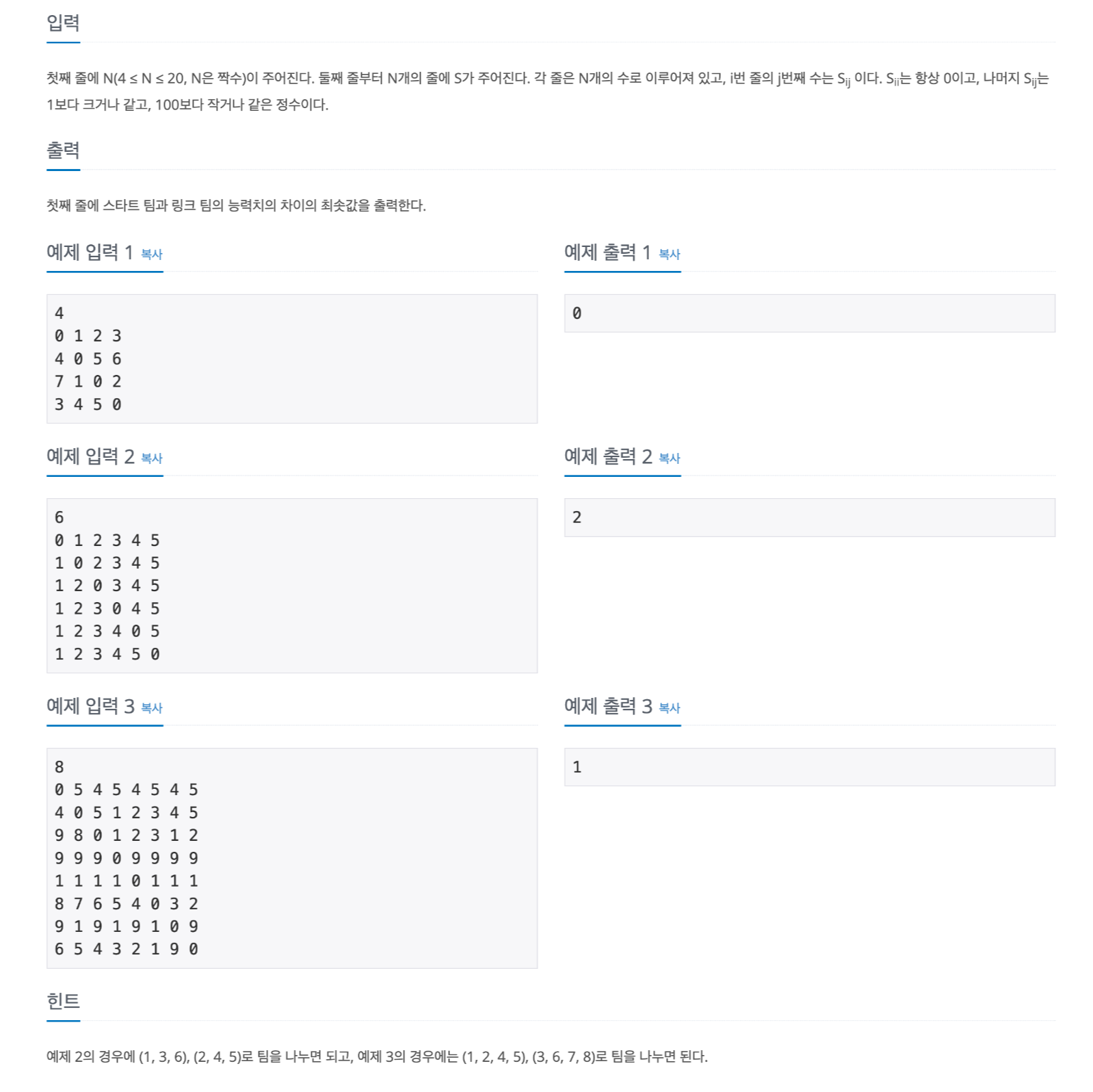 정리하자면 팀을 정확히 N /2 로중복없이나누고, 스타트 팀과 링크 팀의 능력치의 차이의 최솟값을 출력하는 문제입니다.