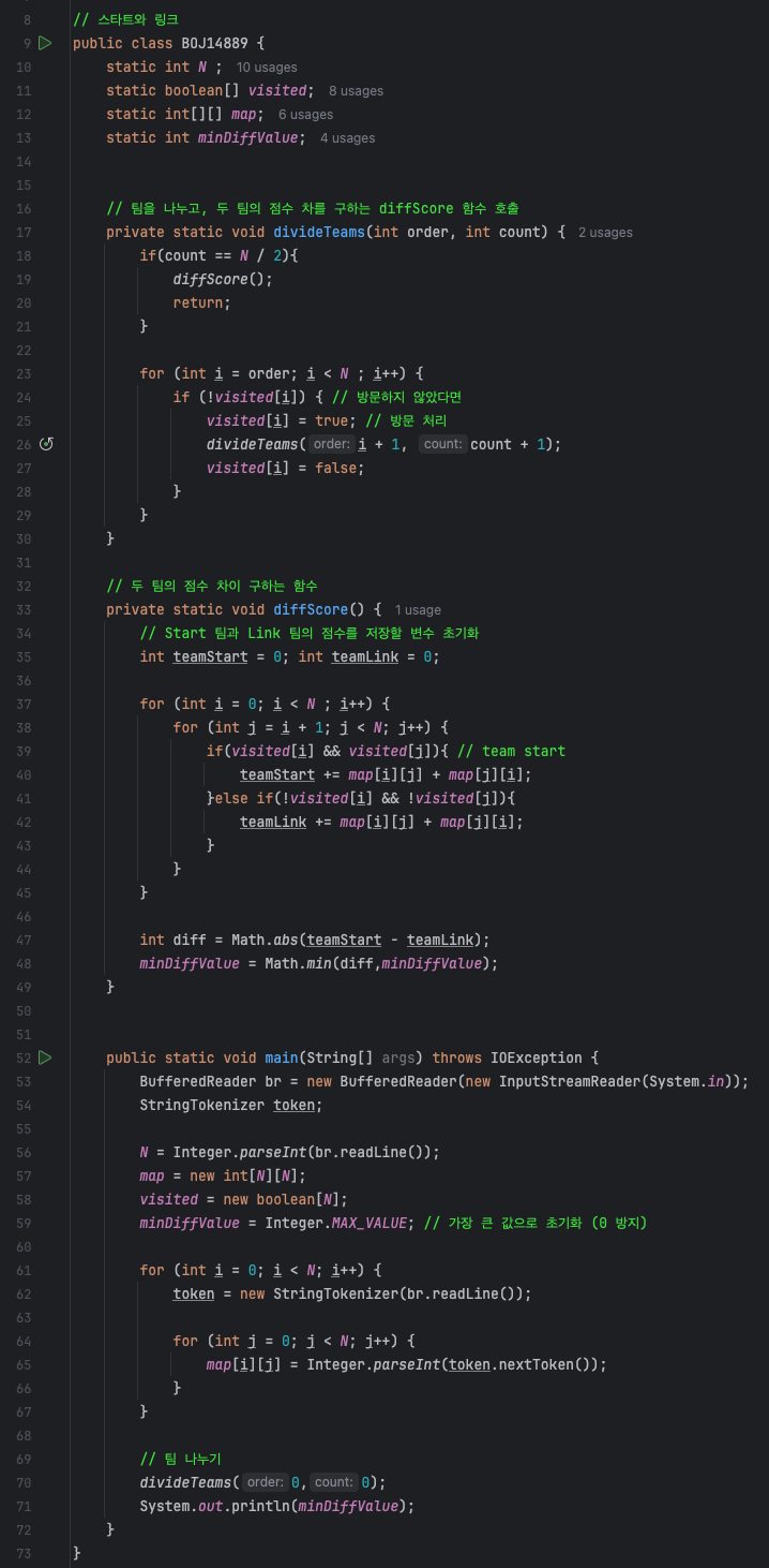 방문하지 않은 인원(i)을 발견하면:- visited[i]를 true로 설정(스타트 팀에 배정)
