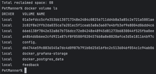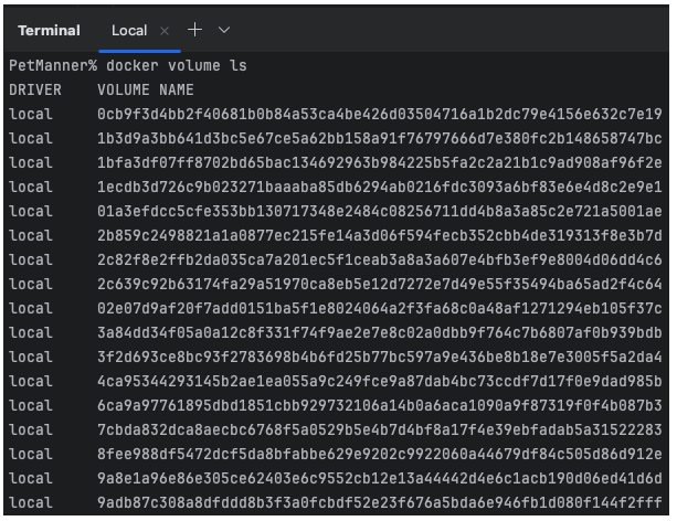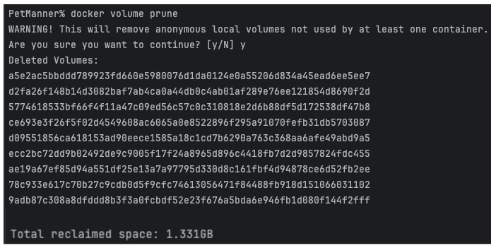 현재 저의 로컬 시스템에는 위와같이 사용하지 않는 익명 볼륨이 아주 많습니다. 하나씩 지정하는 것은 비효율적이기 때문에 prune명령어를 사용하여 간단하게 삭제해보겠습니다.