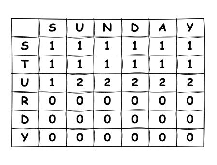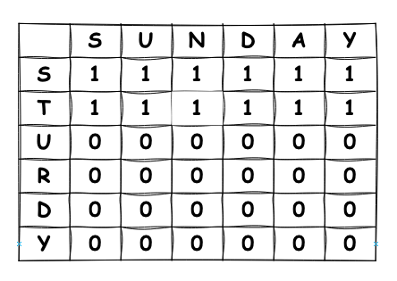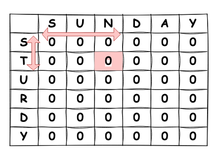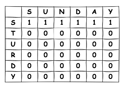 이 때 이전값을 유지하는 이유는 S와 S는 같으므로, LCS길이는 1이되고, 그 다음 'S'와 "SU"를 비교합니다.
