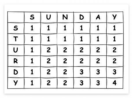 문자열 1: "SUNDAY" 와 문자열 2: "STURDY" 를 한 글자씩 비교를 합니다.