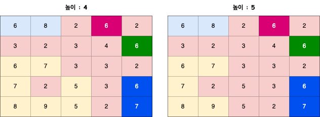 높이가 4일때는 왼쪽 그림과 같이 빨간색 영역이 물에 잠기게 되고, 높이가 5일 경우 오른쪽 그림과 같이 빨간색 영역이 물에 잠기게 됩니다.