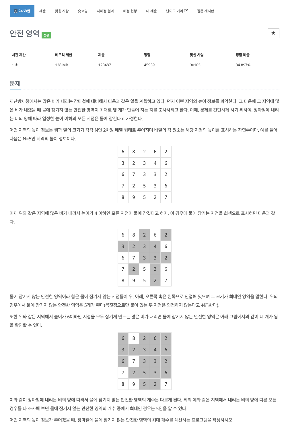 그러면 물에 잠기지 않는 안전한 영역이라 함은 물에 잠기지 않는 지점들이 위, 아래, 오른쪽, 왼쪽으로 인접해 있으며 그 크기가 최대인 영역을 말한다고 합니다.
