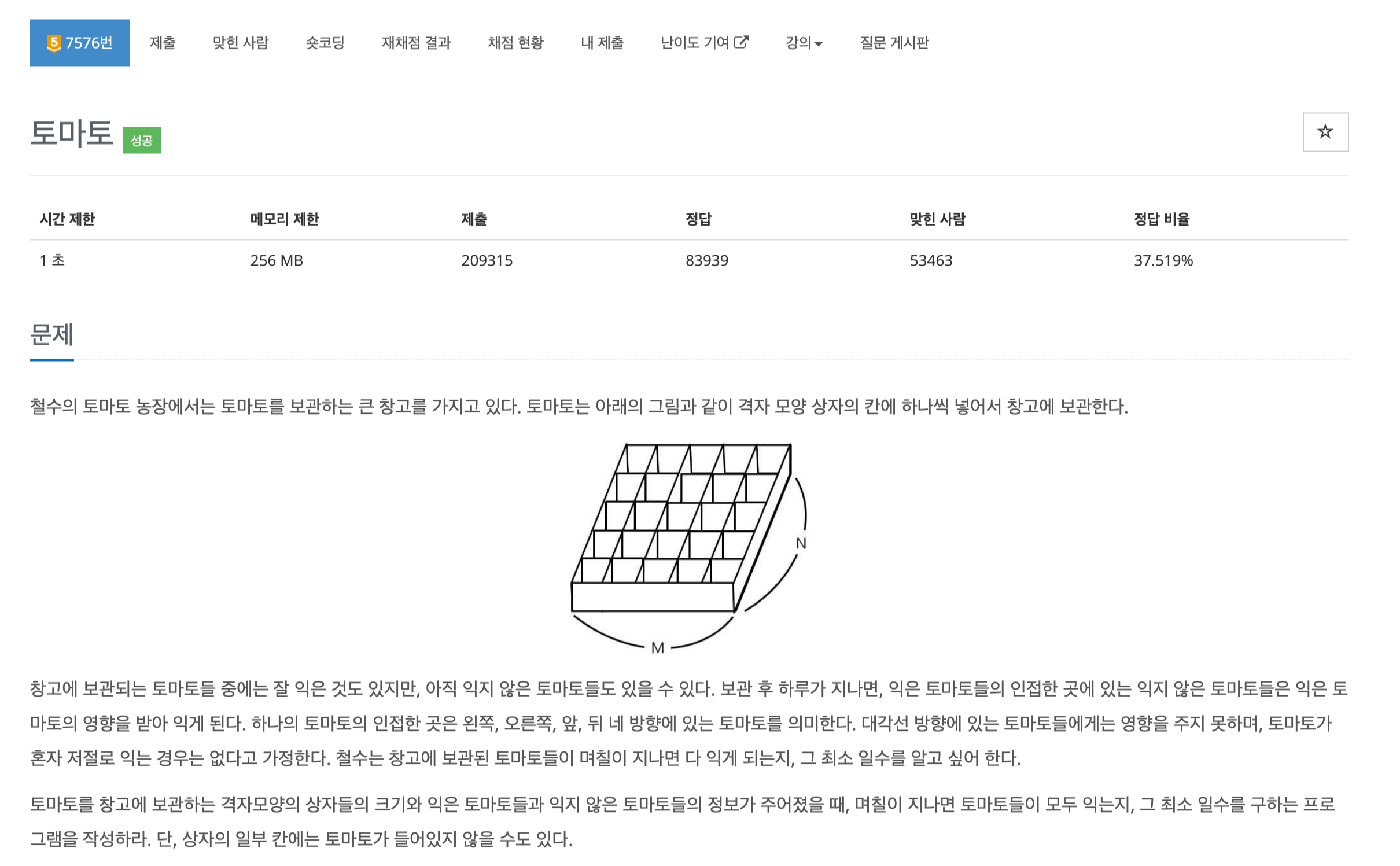 M x N 크기의 상자가 주어지고, 해당 상자의 토마토가 있을 때 다음 조건을 만족하는 토마토가 모두 익을 때까지의 최소 날짜를 출력해야 합니다.