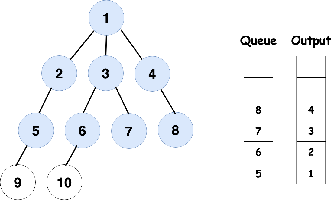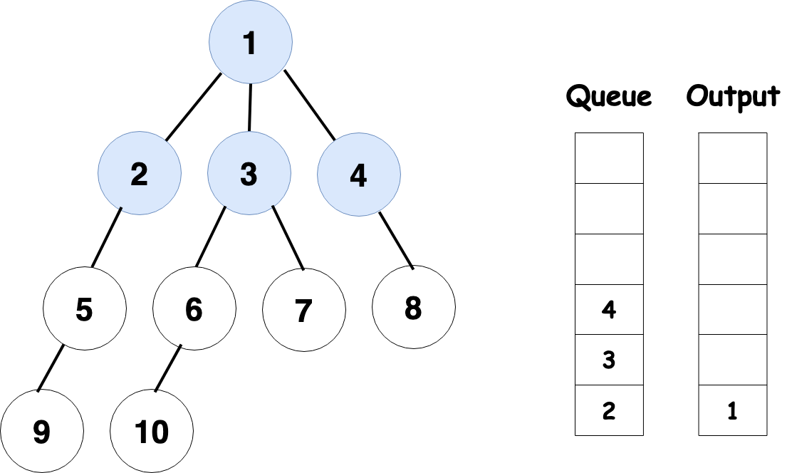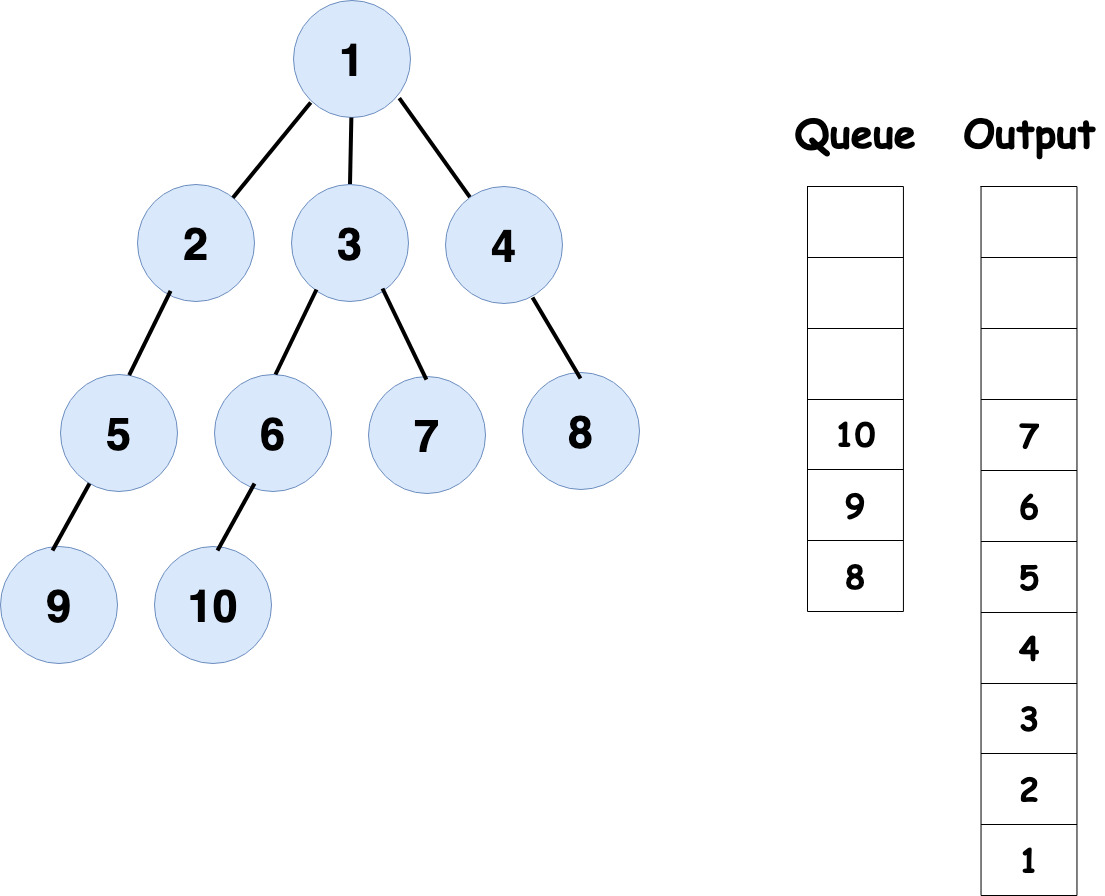 이제 모든 노드를 방문했기 때문에, 큐에서 값을 차례대로 꺼내면서 BFS를 마무리합니다.