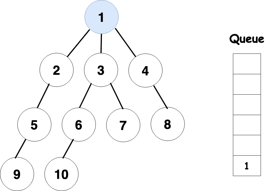 위 그림에서 알 수 있듯이 시작 노드인 1부터 탐색을 시작하여, BFS 알고리즘은 가까운 노드부터 차례대로 방문합니다.