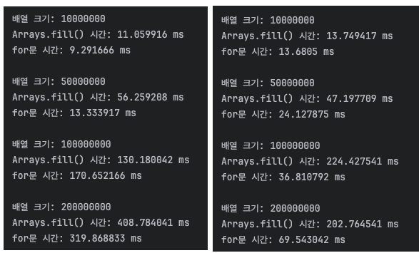 이는 Arrays.fill() 메서드가 내부적으로 처리하는 작업들이 큰 배열에서는 오히려 오버헤드로 작용할 수 있다는 것을 의미합니다.