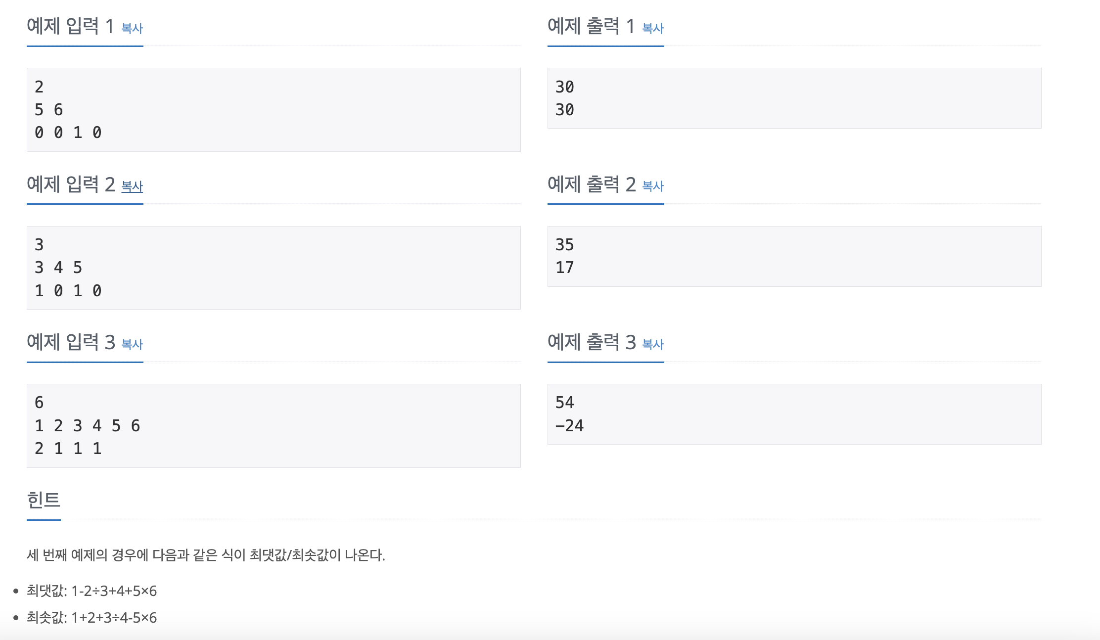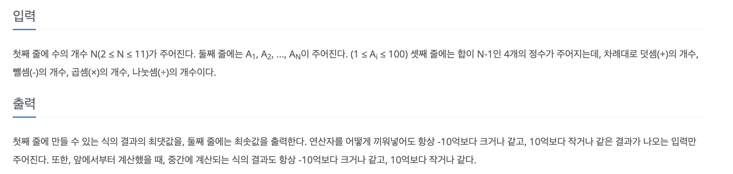 "백준 - 연산자 끼워넣기" 문제는 N개의 수열이 주어지고, N-1개의 연산자가 +, -, * ,/ 순서대로 주어질 때 각 수와 연산자를 조합해서 최댓값과 최솟값을 구하는 문제입니다.