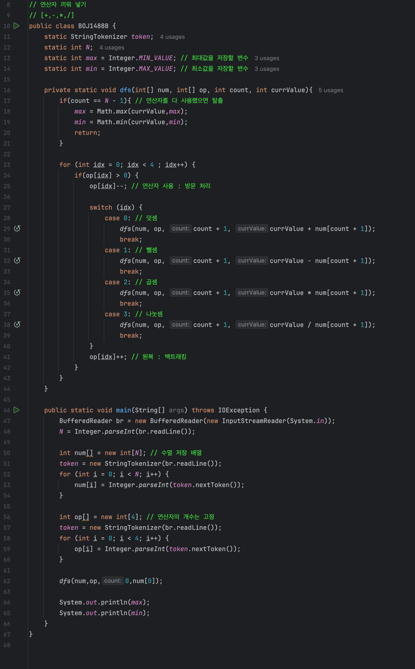 각 연산자의 남은 개수가 0보다 크다면, 해당 연산자를 사용할 수 있다는 의미입니다. 연산자를 선택하면 그 개수를 1 감소시키고, 선택한 연산자로 계산을 수행한 결과값과 함께 다음 단계(count + 1)로 재귀 호출을 진행합니다.