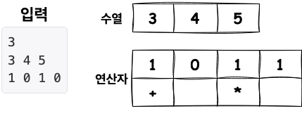 예제 입력2를 수열과 연산자로 표현하면 위와 같습니다. 이 수열과 연산자를 DFS 알고리즘과 백트래킹을 통해 접근하는 과정을 살펴보겠습니다.