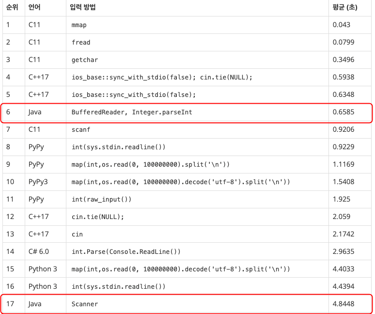백준 사이트의 입력 속도 비교 자료를 보면 위와 같이 BufferedReader클래스를 통한 입력이 높은 순위에 위치하는 것을 알 수 있습니다.